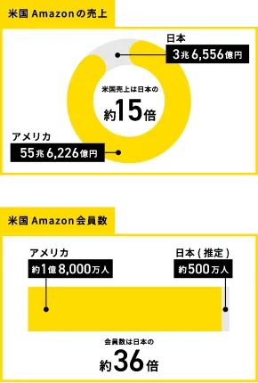海外に目を向けると、米国Amazon市場だけでも売り上げは日本の約15倍以上、会員数も約36倍です。